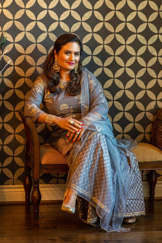 Shop NowA physician by profession, Veena adorns our grey foil sharara set with beauty and grace.