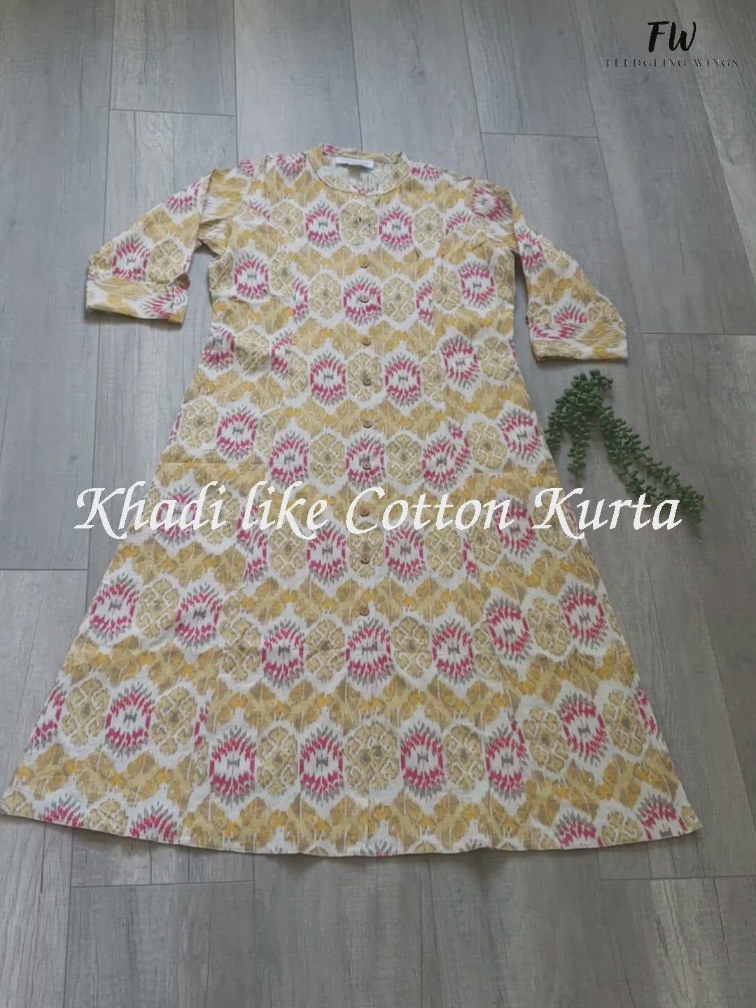 Truly feminine and exclusive range of khadi kurta, it has beautiful gold print and ikkat design all over. The A-line design looks beautiful and feminine, wear it with white pants. It has mandarin collar, three fourth sleeves, and is knee length long.
